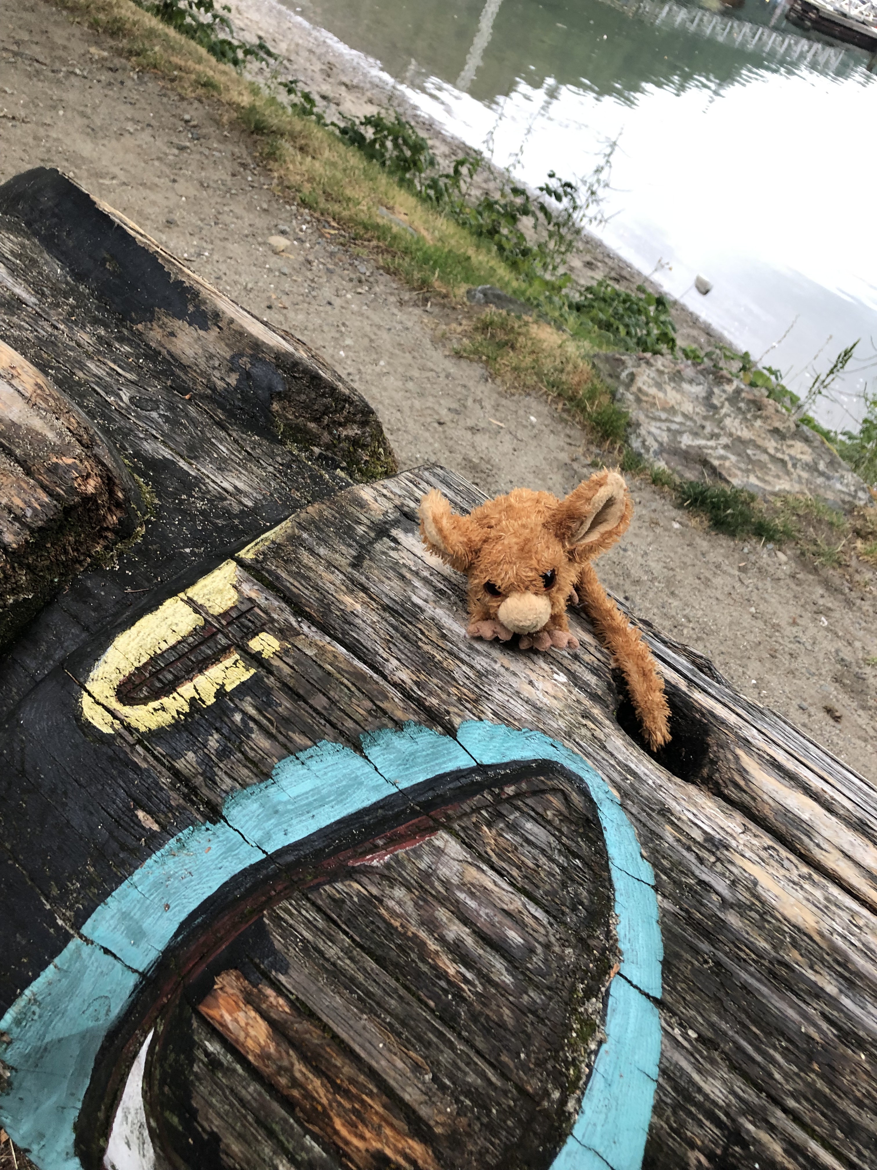We get to the fairy really early and mama says I can go play for a bit. I find this big log. It has paint and carved up and a hole I could make my home. Mama says no.